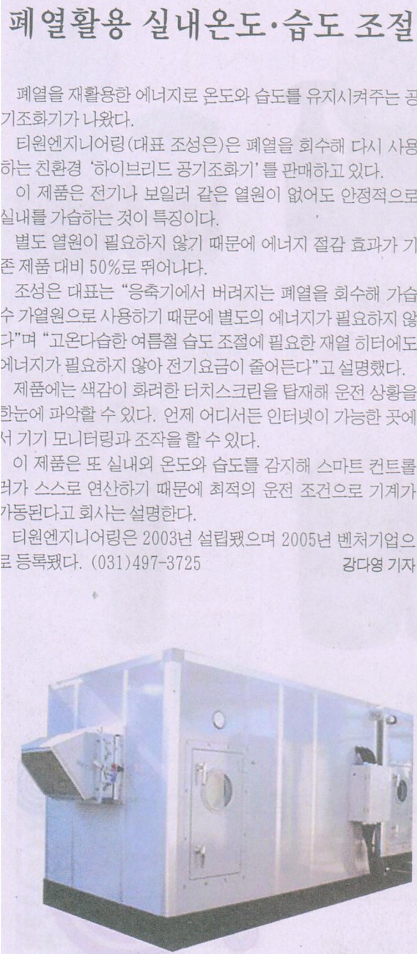 매경 신문 기사 발췌(폐열 활용 종조 시스템) 페이지 정보 작성자 티원엔지니어링 작성일18-12-13 11:49 조회2,730회 이전글 목록 본문 폐열회수 하이브리드 공조시스템 관련(주)티원엔지니어링 관련 기사입니다. 이전글 목록