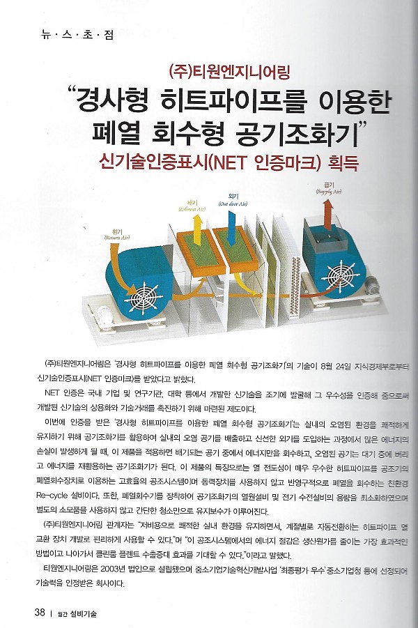 지식경제부 기술표준원으로부터 신기술(NET)인증 페이지 정보 작성자 티원엔지니어링 작성일18-12-13 11:51 조회2,583회 이전글 다음글 목록 본문 티원엔지니어링은 경사형 히트파이프를 이용한 폐열 회수형 공기조화 시스템 기술로 지식표준원으로부터 신기술(NET) 인증을 받았습니다.월간 설비기술 (뉴스초점 입니다.) 이전글 다음글 목록
